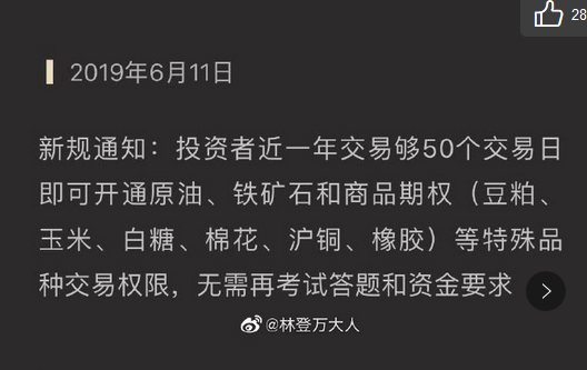 重磅!开通原油、铁矿石和商品期权无需再考试和验资 时间:2019-06-12 来源:新浪财经 6月11日消息,早间市场有消息称:“投资者近一年交易够50个交易日即可开通原油、铁矿石和商品期权等特殊品种交易权限,无需再考试答题和资金要求。” 针对这一消息,新浪财经向交易所询问,得到了确认的回答。 此前,大商所、郑商所、上期所于5月31日同时发布新的期货交易者适当性制度操作指引和期权指南,进一步优化投资者适当性和开户相关流程。 指引提及,期货公司会员为以下客户参与交易实行适当性制度的上市品种申请开立交易编码或者开通交易权限的,可以不对其基础知识要求、交易经历要求、可用资金要求进行评估: 1.符合《证券期货投资者适当性管理办法》规定的专业投资者; 2.已开通实行适当性制度的某一品种交易权限的,再通过其他期货公司会员开通该品种交易权限的客户。客户应当提供具有上述交易权限的证明资料; 3.近一年内具有累计不少于50个交易日境内交易场所的期货合约、期权合约或者集中清算的其他衍生品交易成交记录或者认可境外成交记录。客户应当提供交易记录明细、结算单据或者其他凭证,表明该等交易确已实际成交; 4.做市商、特殊单位客户等交易所认可的其他交易者。 特殊单位客户是指期货公司、证券公司、基金管理公司、信托公司和其他金融机构,以及社会保障类公司、合格境外机构投资者等法律、行政法规和规章规定的需要资产分户管理的单位客户。 |