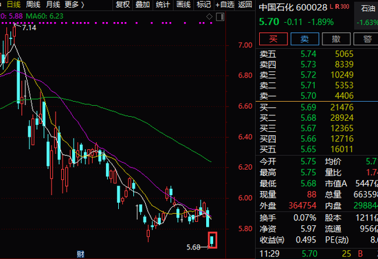 ![]() 而国内的“两桶油”股价近期也持续低迷。截止今日发稿,中国石化A股股价盘中一度低至5.68元,较10月份高位跌幅超过两成。