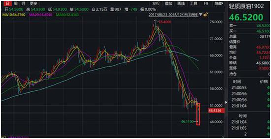 原油再遭惨烈下跌 成品油价又要下调 时间:2018-12-20 来源:本站 国际油价跌势加剧,隔夜又遭遇罕见下跌!NYMEX原油期货收跌近8%,创3年多以来最大单日跌幅。 受到国际油价暴跌影响,早盘上海国际能源中心挂牌的原油期货主力合约盘中暴跌超过5%。 暴跌近8%,国际油价创3年多最大单日跌幅 周二国际油价遭遇惨烈下跌。 NYMEX于明年2月份交货的原油期货合约价格收报46.24美元/桶,跌7.89%,创三年多以来最大单日跌幅,价格刷新2017年8月以来新低,该期货合约盘中低见46.11美元/桶。值得注意的是,上述合约在10月初时一度达76.40美元/桶,这意味着,在两个月左右的时间里,该合约价格最多下跌接近四成。今年10月份之前,国际油价经历了持续数月的上涨,使得2018年内平均价格和2017年相比,大部分时间仍以上涨为主。