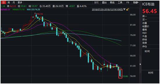 ![]() 当天布伦特原油期货也收跌6.13%,报56美元/桶,刷新2017年10月以来新低,盘中最低报55.86美元/桶。