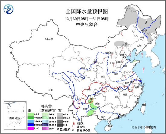 12月29日:未来三天全国天气预报 时间:2014-12-29 来源:中国气象局 华北黄淮有轻到中度霾 较强冷空气影响我国中东部地区 一、重要天气 1. 华北黄淮有轻到中度霾 29日至30日白天,受静稳天气影响,华北、黄淮等地有轻到中度霾。30日夜间开始,受冷空气影响,上述地区的霾天气将自北向南逐渐减弱消散。 2.较强冷空气影响我国中东部地区 30日开始,一股较强冷空气将自西向东影响我国中东部地区,受其影响,西北地区东部、内蒙古、华北、黄淮、江淮等地将先后出现6~8℃的降温,局地降温可达10℃,上述部分地区并伴有5~6级偏北风。渤海、黄海、东海将有7~9级、阵风10~11级西北风。 二、未来三天具体预报 12月29日08时至30日08时,内蒙古东部、黑龙江西北部和东北部、吉林中东部等地有小雪或阵雪。内蒙古中西部的部分地区有4~6级风。台湾海峡、南海东北部、南海中部和南部有6~7级、阵风8级的东北风。 30日08时至31日08时,内蒙古东北部及中部偏南地区、黑龙江大部、吉林东部、山东半岛北部等地有小雪或雨夹雪;云南东部、贵州西部等地有小雨或阵雨。内蒙古中西部、华北、西北地区东部、黄淮等地有4~6级风。渤海有7~8级偏北风。 12月31日08时至1月1日08时,黑龙江南部、吉林中东部、山东半岛中东部等地有小雪或阵雪,局地中雪;云南东部、贵州西部、四川东南部等地有小雨或阵雨。内蒙古中部、华北、黄淮、江淮、东北地区西南部等地有4~6风。渤海、黄海大部有7~9级、阵风10~11级西北风,东海大部、台湾海峡、南海西南部有7~9级、阵风10级的东北风。