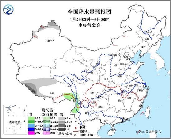 12月31日:未来三天全国天气预报 时间:2014-12-31 来源:中国气象局 较强冷空气影响我国中东部地区 一、重要天气 1. 较强冷空气影响我国中东部地区 受较强冷空气影响,31日08时至2015年1月1日08时,东北中南部、华北、黄淮、江淮、江汉、江南大部等地气温将下降4~6℃,其中,黄淮、江淮等地的部分地区降温有8℃,局部10℃;上述大部地区以及内蒙古中东部伴有4~6级偏北风,江河湖面风力可达7~8级。渤海、渤海海峡、黄海大部、东海北部有7~8级、阵风9~10级的西北风,东海南部、台湾海峡、巴士海峡、台湾以东洋面、南海大部有7~8级、阵风9~10级的北到东北风。 中央气象台31日06时继续发布海上大风黄色预警和大风降温预报。 二、未来三天具体预报 2014年12月31日08时至2015年1月1日08时,黑龙江东南部、吉林东部、山东半岛等地有小雪,其中,山东半岛的部分地区有中雪;贵州西部、云南东部的部分地区有小雨。内蒙古中东部、华北、东北地区南部、黄淮、江淮等地有4~6级偏北风;东部和南部海域有7~8级、阵风9~10级偏北风。 2015年1月1日08时至1月2日08时,西藏西南部、吉林东南部等地的部分地区有小雪;云南东北部、贵州西北部、四川东南部等地的部分地区有小雨或阵雨。内蒙古中部等地有4~6风;东部和南部大部海域有7~8级、阵风9~10级偏北风。 1月2日08时至1月3日08时,新疆西北部、西藏南部等地有小到中雪,其中,西藏西南部的局部有大到暴雪;西藏东南部、云南西北部等地的部分地区有小雨。新疆西部有4~6级风;台湾海峡、南海大部有7~9级、阵风9~10级的大风。