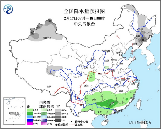 02月16日:未来三天全国天气预报 时间:2015-02-16 来源:中国气象局 东北地区有较强降雪 南方地区有大范围降水天气 一、重要天气 1、东北地区有较强降雪 16日至18日,内蒙古东部、东北地区大部、华北北部等地有小到中雪或雨夹雪,其中辽宁东部、吉林南部等地的部分地区有大雪,局地暴雪(10~15毫米)。 2.南方地区有大范围降水天气 16日至18日,西南地区东部和南部、华南大部、江南西部和中南部等地有小到中雨,局地大雨; 3. 华北黄淮等地霾消散 受冷空气的影响,从16日早晨开始,华北、黄淮等地的雾、霾天气将自北向南逐渐减弱消散。 二、未来三天具体预报 16日08时至17日08时,内蒙古东部、东北地区大部、华北北部等地有小到中雪或雨夹雪,其中辽宁东部、吉林南部有大雪,局地暴雪(10~15mm);山东半岛、西南地区东部和南部、华南西部、江南西部等地有小到中雨。内蒙古中部、华北北部、辽东半岛、山东半岛等地有5~6级风。 17日08时至18日08时,新疆北部和沿天山地区、青海西南部、东北地区中北部等地有小到中雪或雨夹雪,其中新疆西北部、吉林南部等地的部分地区有大雪;西北地区东南部、云南东部、贵州大部、江南西部和中南部、华南大部等地有小雨,局地有中雨。内蒙古中部、辽东半岛、山东半岛等地有5~6级风。 18日08时至19日08时,新疆北部、内蒙古中部、吉林东部、西北地区东部、华北西南部等地有小雪或雨夹雪,其中北疆北部局地有中到大雪;西北地区东南部、西南地区东部、云南东南部、江南西部和南部、华南大部等地有小到中雨,局地有大雨。台湾海峡将有7~8级、阵风9级的东北风。