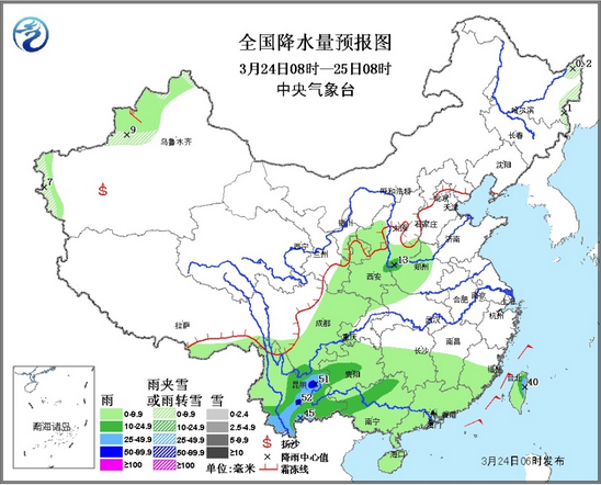 03月24日:未来三天全国天气预报 时间:2015-03-24 来源:中国气象局 云南大部有降雨过程 一、重要天气 1. 云南大部有降雨过程 24至25日,云南有小到中雨并伴有雷暴,其中云南东部和西南部的局部地区有大雨。 2. 华北黄淮等地将有霾 24日开始,华北、黄淮等地的空气污染扩散条件逐渐转差,25至27日将有一次轻至中度霾过程。 3. 弱冷空气将影响新疆等地 受弱冷空气影响,24日夜间至27日,新疆北部和东部、内蒙古中西部、西北地区中部等地先后有4~6级偏北风,新疆北部山口地区风力可达8级左右;新疆南疆盆地、甘肃西部、内蒙古西部等地有浮尘或扬沙;上述部分地区气温将下降4~6℃,局地降温幅度可达8℃。 二、未来三天具体预报 24日08时至25日08时,新疆北疆西部等地的部分地区有小雪或雨夹雪;西北地区东部、华北西南部、黄淮西部、西南地区东部和南部、江南南部、华南、台湾等地有小到中雨,其中云南东部和西南部、台湾东北部等地的部分地区有大雨。新疆北部等地有5~6级风,山口地区风力可达7~8级。东海南部、台湾海峡、南海东北部有7~8级风、阵风9级。新疆南疆盆地等地有浮尘或扬沙。 25日08时至26日08时,新疆北部等地的部分地区有小到中雪或雨夹雪;西北地区东部、华北西南部、黄淮西部、江汉西部、西南地区东部和南部、江南西部和南部、华南、台湾等地有小到中雨,局地大雨。新疆北部和东部等地有5~6级风,山口地区风力可达7~8级。台湾海峡、南海东北部有7~8级风、阵风9级。新疆南疆盆地、内蒙古西部、甘肃西部等地的部分地区有扬沙或浮尘。 26日08时至27日08时,新疆北部等地的部分地区有小雪或雨夹雪;西北地区东南部、西南地区东部和南部、华北西南部、黄淮西部、江汉、江淮西部、江南、华南等地有小到中雨,其中广西西南部有大雨,局地暴雨。新疆东部、甘肃西部、内蒙古西部等地有4~6级风。新疆南疆盆地等地有浮尘或扬沙。