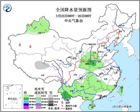 03月25日:未来三天全国天气预报 时间:2015-03-25 来源:中国气象局 华北黄淮等地将有霾 云南贵州广西有中雨 一、重要天气 1. 华北黄淮等地将有霾 25至27日,华北、黄淮等地的空气污染扩散条件逐渐转差,将有一次轻至中度霾过程。 2. 云南贵州广西有中雨 25至27日,南方大部将出现小雨或阵雨,其中,云南南部和东部、贵州大部、广西中西部等地有中雨,局部地区有大雨。 3. 弱冷空气将影响新疆等地 受弱冷空气影响,25至27日,新疆北部和东部、内蒙古中西部、西北地区中部等地先后有4~6级偏北风,新疆北部山口地区风力可达8级左右,部分地区有浮尘或扬沙;上述地区气温将下降4~6℃,局地降温幅度可达8℃。 二、未来72小时具体预报 25日08时至26日08时,西藏北部、新疆阿勒泰地区和沿天山西部等地有小雪或雨夹雪;甘肃东部、陕西大部、山西南部、河南大部、湖北西部、西南地区南部、江南西部和南部、华南中西部和北部、台湾等地有小到中雨,其中云南南部、海南东部等地的局部地区有大雨,上述地区并伴有雷暴。新疆北部、内蒙古东南部、东北地区中南部等地有5~6级风,山口风力可达8~9级,南疆盆地有浮尘或扬沙。台湾海峡、巴士海峡、南海东北部海域将有7~8级、阵风9级的东北风。 26日08时至27日08时,新疆阿勒泰地区和沿天山西部有雨夹雪;新疆北部、陕西南部、黄淮西部及其以南的大部地区有小雨,其中云南南部和东部、广西西南部、浙江东部等地有中雨。新疆东部和内蒙古北部有5~6级风,山口地区风力可达7~8级。新疆南疆盆地有扬沙或浮尘。 27日08时至28日08时,新疆阿勒泰地区、内蒙古东北部、青海东北部等地有小雪或雨夹雪;黑龙江西南部、吉林西部、甘肃南部、陕西南部、湖北西部、西南地区中东部、江南西部和东部、华南中西部等地有小到中雨,其中贵州北部有大雨。内蒙古中西部和宁夏等地有5~6级风。 |