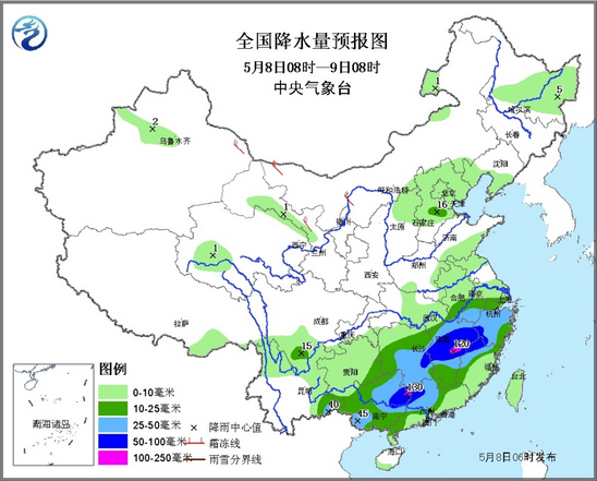 05月08日:未来三天全国天气预报 时间:2015-05-08 来源:中国气象局 中央气象台继续发布暴雨蓝色预警 江南华南等地有强对流天气 一、重要天气 1. 中央气象台继续发布暴雨蓝色预警 预计,5月8日08时至9日08时,广西东北部和西南部、广东中北部、湖南中南部、江西中北部、福建西北部、浙江大部、安徽南部等地有大到暴雨,其中江西东部、广西东北部、广东西北部等地的局部地区有大暴雨(100~130毫米)。 2. 江南华南等地有强对流天气 中央气象台5月8日06时继续发布强对流天气蓝色预警。预计5月8日08时至9日08时,浙江中南部、江西中南部、福建中西部、湖南中南部、广东中北部、广西东北部和南部、云南东部等地的部分地区有短时强降水,预计小时雨强可达20~50毫米,局地可超过70毫米。河北东南部、山西北部、甘肃南部、福建西北部、江西中东部、广东西北部、广西东北部和南部、四川南部等地的部分地区有雷暴大风或冰雹天气。 3. 西藏震区有阵性雪(雨)天气 8~10日,震区天气阴天间多云,有阵性降雪(雨)天气。 二、未来三天具体预报 5月8日08时至9日08时,华北中部、江南大部、华南大部、贵州东南部、云南东部、四川南部等地有中到大雨,其中,广西西北部、广东北部、湖南南部、江西中北部、福建西北部、浙江西南部等地的部分地区有暴雨,局地大暴雨 (100~130毫米),上述部分地区并伴有雷暴等强对流天气。新疆东北部、甘肃河西、内蒙古西部等地的部分地区有4~6级风。 5月9日08时至5月10日08时,内蒙古中西部、甘肃河西、西北地区东北部、华北大部、黄淮东北部、四川南部、贵州大部、云南西北部和东部、江南东部和南部、华南大部、新疆北疆西部、西藏东南部等地有小到中雨,其中广东中部、广西东南部等地的部分地区有大雨;上述部分地区并伴有雷暴等强对流天气。新疆南疆盆地、内蒙古西部等地有扬沙或浮尘天气,局地有沙尘暴。新疆南疆盆地东部、青海北部、内蒙古中西部等地的部分地区有4~6级风。 5月10日08时至5月11日08时,内蒙古中东部、东北地区西部、西北地区东部、华北、黄淮中西部、江淮、江汉、西南地区东部、江南、华南、新疆北疆北部和北疆西部、西藏中部等地有小到中雨,其中华北东北部、江南中部、华南中部等地的部分地区有大雨,局地暴雨;上述部分地区并伴有雷暴等强对流天气。新疆南疆盆地、甘肃河西等地有扬沙或浮尘天气,局地有沙尘暴。新疆南疆盆地东部、青海北部、内蒙古等地的部分地区有4~6级风。巴士海峡有10~12级、阵风13~14级的旋转风,台湾以东洋面有8~10级、阵风11~12级的东北风。 |