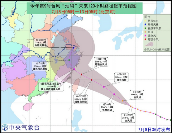07月08日:未来三天全国天气预报 时间:2015-07-08 来源:中国气象局 “莲花”将正面袭击粤闽等地 “灿鸿”将于9日进入东海 一、重要天气 1、“莲花”将正面袭击粤闽等地 今年第10号台风“莲花”(强热带风暴级)的中心今8日05时位于北纬21.3度、东经118.6度,中心附近最大风力有10级(28米/秒),中心最低气压为982百帕,7级风圈半径230-290公里,10级风圈半径50公里。预计,“莲花” 将以每小时10公里左右的速度向西北方向移动,逐渐向广东东部到福建南部一带沿海靠近,强度将有所加强,并将于9日白天在广东汕尾到福建漳浦一带沿海登陆,登陆强度为强热带风暴级(10-11级,25-30米/秒)。登陆后,“莲花”将转向西偏南方向移动,强度逐渐减弱;受其影响,福建南部、广东东部、台湾南部等地的部分地区将有大雨或暴雨,局地有大暴雨(100-200毫米)。中央气象台7月8日06时继续发布台风黄色预警以及发布暴雨蓝色预警。 2、“灿鸿”将于9日进入东海 今年第9号台风“灿鸿”的中心今8日05时位于北纬19.3度、东经133.9度,中心附近最大风力有12级(35米/秒),中心最低气压为970百帕,7级风圈半径380-400公里,10级风圈半径80-100公里,12级风圈半径20公里。预计,“灿鸿”将以每小时20公里左右的速度向西北方向移动,强度逐渐加强,将于10日白天进入东海东南部海面,最强可达超强台风级(16-17级,52-58米/秒) ,然后逐渐向浙闽一带沿海靠近,并有可能于10日夜间至11日上午登陆上述沿海地区,登陆强度可达强台风级或超强台风级(14-16级,45-52米/秒)。受其影响,浙江东部、福建东北部及台湾中北部等地的部分地区有大到暴雨,局地有大暴雨或特大暴雨(250~300毫米)。 3、西北地区等地有一次降水过程 8至9日,青藏高原中东部、西北地区中部和西南地区中西部自西向东将有一次小到中雨降水过程,局部地区有大到暴雨。 二、天气实况 7月7日8时至8日6时,西藏中部、青海东北部、甘肃河西走廊、宁夏北部、内蒙古中部、四川东北部、湖南南部、安徽南部、浙江西南部、福建南部等地部分地区出现大雨,内蒙古赤峰、湖南衡阳等局地出现暴雨(50~88毫米)。 三、未来三天具体预报 7月8日08时至7月9日08时,青藏高原大部、甘肃中东部、内蒙古西部、四川盆地中西部、黄淮南部、江淮大部、江南中东部、华南东部、台湾等地的部分地区有小到中雨,其中,甘肃中部、广东东部、福建南部、台湾中南部的部分地区有暴雨,局地有大暴雨(100~200毫米),上述局地将伴有短时雷暴大风等强对流天气。东海南部、南海东北部、台湾海峡、巴士海峡将有6~9级大风,“莲花”中心经过的附近海域的风力可达10~12级、阵风13~14级。 9日08时至10日08时,新疆西部、西藏西部和南部、云南、四川大部、甘肃南部、内蒙古西部和北部、黑龙江北部、黄淮大部、江淮、江南、华南中东部及台湾等地有小到中雨,其中云南西北部、福建南部、江西南部、湖南东南部、广东北部及台湾北部等地的部分地区有大到暴雨,局地大暴雨(100~230毫米);上述局部地区还将伴有短时强降水、雷暴大风等强对流天气。东海南部、台湾以东洋面将有9~11级、阵风12~13级的大风,部分海域风力可达12~14级,“灿鸿”中心经过的附近海域风力将有15~17级,阵风17级以上,台湾海峡、巴士海峡、东海北部、南海的部分海域将有6~9级、阵风9~11级的大风。 10日08时至11日08时,新疆西部和北部、西藏大部、云南西部、川西高原、内蒙古中东部、辽宁南部、华北东部、黄淮、江淮、江南、华南大部及台湾等地有小到中雨,其中,浙江东部、福建东北部及台湾中北部等地的部分地区有大到暴雨,局地有大暴雨或特大暴雨(250~300毫米);上述局部地区还将伴有短时强降水、雷暴大风等强对流天气。东海南部、台湾以东洋面将有10~12级、阵风13~14级的大风,部分海域风力可达13~15级,“灿鸿”中心经过的附近海域风力将有16~17级,阵风17级以上,台湾海峡、巴士海峡、东海北部、南海部分海域将有6~10级、阵风9~12级大风。