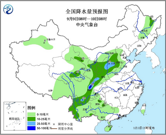 09月08日:未来三天全国天气预报 时间:2015-09-08 来源:中国气象局 云南四川局部有暴雨 北方地区有过程性降雨 一、重要天气 1. 云南四川局部有暴雨 预计8日,云南南部、广西西部等地的部分地区有大雨或暴雨(日雨量50~70毫米);此次降雨过程以短时强降水为主并伴有明显的雷电活动,最大小时雨强30~50毫米。 此外,受高原槽和暖湿气流共同影响,西南地区大部将有一次过程性降雨,预计8~10日,四川盆地西部和北部等地的部分地区有大到暴雨(50~90毫米),上述地区并伴有短时强降水等强对流天气。 2.北方地区有过程性降雨 受冷空气影响,我国北方将有一次过程性降雨,预计8~9日,西北地区中东部、内蒙古大部、华北、东北等地自西向东先后有小到中雨,局部地区将有大雨或暴雨。 二、天气实况 7日08时至8日06时,新疆阿克苏地区和南疆西部、甘肃中西部、陕西西南部等地的部分地区出现中到大雨,陕西略阳局地降暴雨;南方地区出现分散性强降雨,贵州西南部、云南东部、广西中东部、广东中部等地部分地区出现暴雨,广西南宁、贵港和北海,广东广州等局地降大暴雨(100~169毫米)。 三、未来三天具体预报 8日08时至9日08时,新疆南疆西部、内蒙古大部、东北地区西北部、华北西部、西北地区中东部、青藏高原东部、西南地区大部、华南中西部等地有小到中雨,其中,陕西北部、四川盆地西部、云南南部、广西西部、黑龙江北部等地的部分地区有大雨,局地有暴雨(50~70毫米);云南南部局地还将伴有短时强降水等强对流天气。 9日08时至10日08时,西北地区东部、青海东南部、甘肃中部、华北中西部、四川盆地西部、川西高原南部、云南西部和北部、贵州东部、黑龙江东北部等地有中到大雨,其中,四川盆地西北部等地的部分地区有暴雨(50~70毫米);上述局地还将伴有短时强降水等强对流天气。 10日08时至11日08时,华北中北部、青海东北部、甘肃中南部、西北地区东南部、黄淮西北部、江汉北部、四川大部、广西中东部、黑龙江东北部等地有中到大雨,其中,陕西南部、四川盆地中部等地的部分地区有暴雨(50~90毫米);上述局地还将伴有短时强降水等强对流天气。