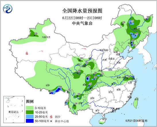 06月21日:未来三天全国天气预报 时间:2016-06-21 来源:中国气象局 江淮等地有强降雨 华南江南华北等地有高温 一、重要天气 1.江淮等地有强降雨 未来三天,主雨带将从江汉江淮一带逐渐北抬至西北地区东南部到淮北一带,上述地区将有较强降水。预计21日08时至22日08时,湖北东部、河南东南部、安徽中北部、江苏大部等地有区域性大雨或暴雨,其中,安徽东北部、江苏北部等地的局部地区有大暴雨(100~150毫米),上述地区伴有短时强降水天气,小时雨强30~50毫米,局地可达60~80毫米,局部地区可能伴随有8~9级雷暴大风。此外,云南西北部和东北部、四川盆地南部、西藏东南部等地局地有分散性大雨或暴雨。中央气象台6月21日06时继续发布暴雨黄色预警。 2.东北华北等地将出现强对流天气 未来三天,受高空槽东移影响,东北地区中西部、华北东北部、内蒙古东部等地有中到大雨,局地暴雨天气。上述地区伴有雷暴大风冰雹等强对流天气。 3.华南江南华北等地有高温 21至23日,受副热带高压影响,华南大部、江南大部、华北南部、黄淮北部、陕西关中地区、四川盆地东部以及新疆南疆盆地等地的部分地区有35℃以上的高温,局地可达37℃以上。 二、未来具体预报 21日08时至22日08时,华北东南部、东北地区中部、西藏东南部、四川盆地南部、云南西北部和东北部、湖北东部、河南东南部、安徽中北部、江苏大部等地有大雨或暴雨,其中,安徽东北部、江苏北部等地的局部地区有大暴雨(100~150毫米)。上述部分地区伴有短时强降水或雷暴大风。新疆南疆盆地等地的部分地区有4~5级风。黄海北部和中部海域将有大雾或浓雾。 22日08时至23日08时,新疆伊犁河谷地区、东北地区中西部、西藏东南部、青海东南部、川西高原北部、西北地区东部、四川盆地中部和北部、重庆北部、湖北西北部、江苏南部、云南西部和北部等地有的部分地区中到大雨,其中,辽宁中部、四川盆地北部、西藏东南部等地的局部地区有暴雨(50~90毫米)。上述部分地区伴有短时强降水或雷暴大风。新疆南疆盆地、内蒙古中西部等地的部分地区有4~5级风。 23日08时至24日08时,新疆沿天山地区、西藏东南部、东北地区北部和东部、华北东部和南部、西北地区东部、西南地区东部、黄淮大部、江汉北部、江淮北部、云南西部等地有中到大雨,其中,四川盆地东北部和西南部、陕西南部、河南中南部、安徽北部、山东南部、江苏北部等地有暴雨,部分地区有大暴雨(100~160毫米)。上述部分地区伴有短时强降水或雷暴大风。内蒙古大部、华北北部和东部等地的部分地区有4~6级风。