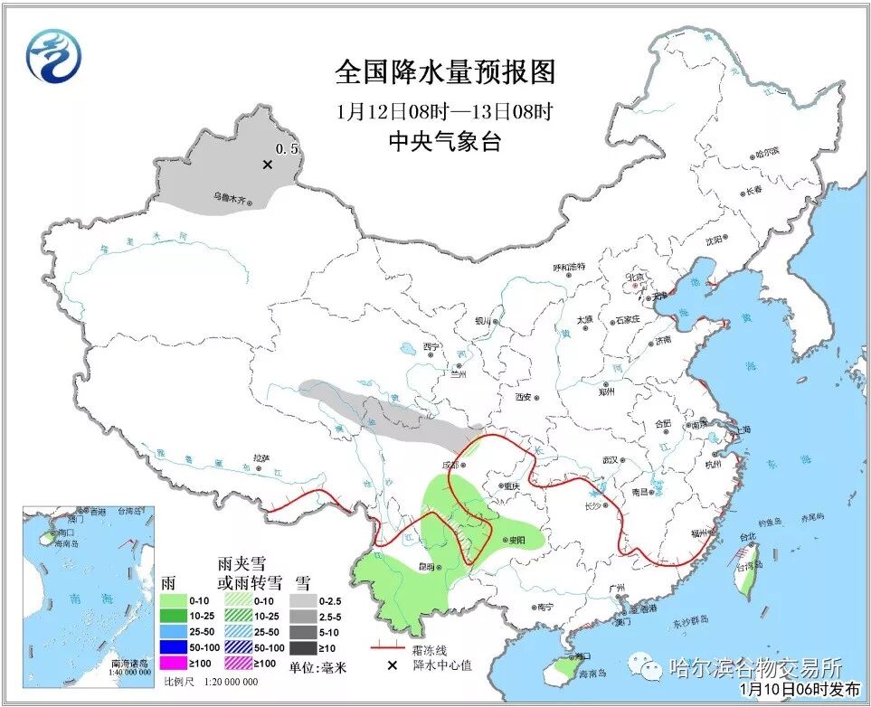 图4 全国降水量预报图(1月12日08时-13日08时) 四、影响与关注 1、中东部地区有大风降温天气,未来三天黄淮、江淮、江汉等地气温明显偏低,需防范低温寒冷天气的不利影响; 2、贵州、云南部分地区需防范雨雪冰冻灾害; 3、10-11日东部和南部海区大风天气的不利影响。