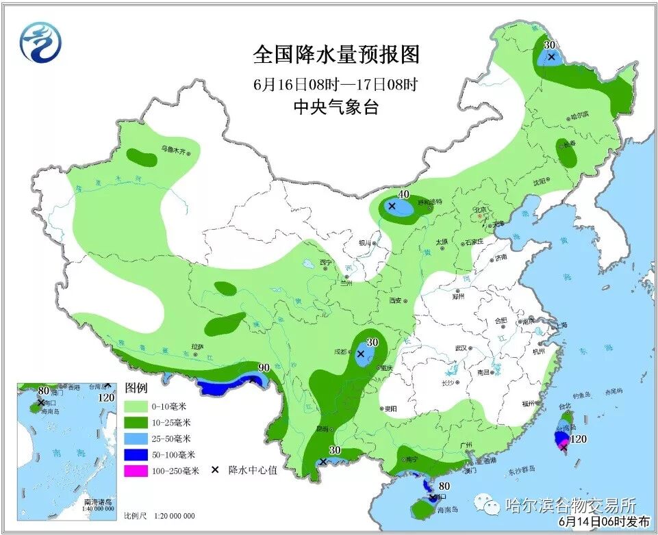 图2 全国降水量预报图(6月15日08时-16日08时) 6月16日08时至17日08时,东北等地多对流性天气。黑龙江北部、吉林中部、内蒙古西部、四川盆地大部、云南中部和西北部、西藏南部、华南南部、海南岛、台湾等地有中到大雨,其中,雷州半岛、海南岛北部、西藏东南部以及台湾南部等地的部分地区有暴雨或大暴雨(100~120毫米),上述局地将伴有短时强降水、雷暴大风或冰雹等强对流天气(见图3)。