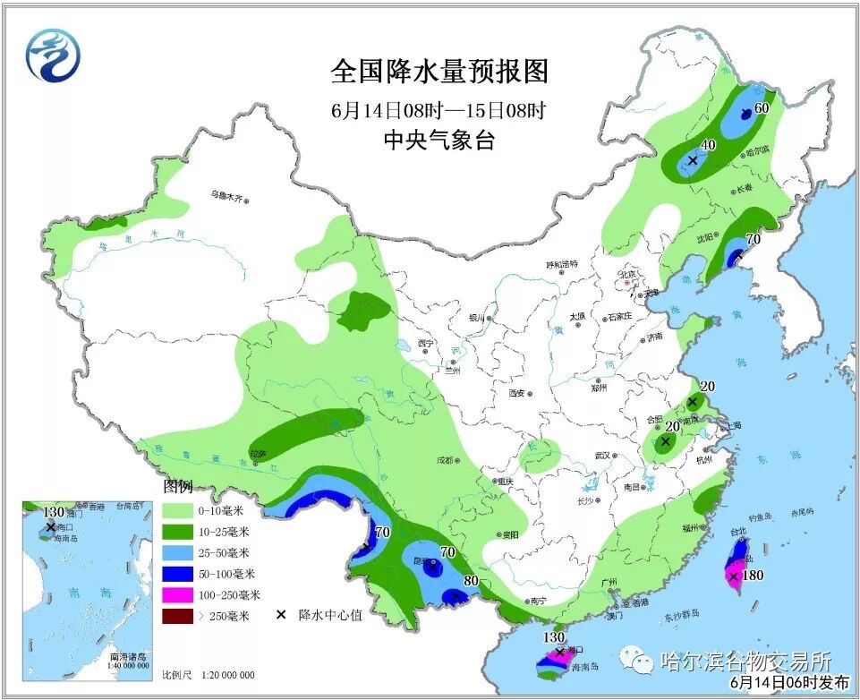 06月14日:未来三天全国天气预报 时间:2018-06-14 来源:天气网 云南海南台湾将有较强降雨 东北多雷雨局地强对流 一、北方地区出现分散性雷雨 部分地区伴有强对流天气 昨日,内蒙古东部、华北中东部、黄淮北部、东北地区出现分散性雷雨天气,北京、河北东北部、山东北部和东部、内蒙古东北部、黑龙江西北部等地出现大雨或暴雨,上述地区局地最大小时降水量57~66毫米;北京、河北中南部、山东、河南北部等地的部分地区出现8~9级雷暴大风和局地冰雹天气。 另外,云南西部和东北部、广西南部、广东西南部等地出现暴雨,广西崇左和百色局地大暴雨(100~142毫米)。 二、重点天气预报 1. 云南海南台湾将有较强降水 预计14日~15日,海南岛、云南西北部和东部、西藏东南部、台湾等地的部分地区有大到暴雨,局地有大暴雨。 2. 东北多雷雨局地强对流 未来一周,东北地区、内蒙古东部等地多阵雨和雷阵雨,局部地区有冰雹和雷暴大风等强对流天气。 预计6月14日08时至15日08时,江苏中部等地仍需防范局地的雷暴大风或冰雹天气;此外,黑龙江西部、辽宁南部、山东半岛、江苏中部、云南西北部及东南部、广西南部、广东南部、海南等地将有短时强降水天气,最大小时降水量20~40毫米,局地可达50毫米。 三、未来三天具体预报 6月14日08时至15日08时,东北地区有对流性天气,云南海南台湾等地有较强降水。内蒙古东北部、黑龙江西部、吉林西部和东南部、辽宁中东部、山东半岛东部、江淮中东部等地有中到大雨,黑龙江西北部、辽宁东南部等地局地有暴雨,上述部分地区伴有雷暴大风、冰雹等强对流天气;西藏东南部、云南西北部和东部、雷州半岛、海南岛中北部以及台湾等地的部分地区有大到暴雨,海南岛北部、台湾南部等地局地有大暴雨(100~180毫米)(见图1)。