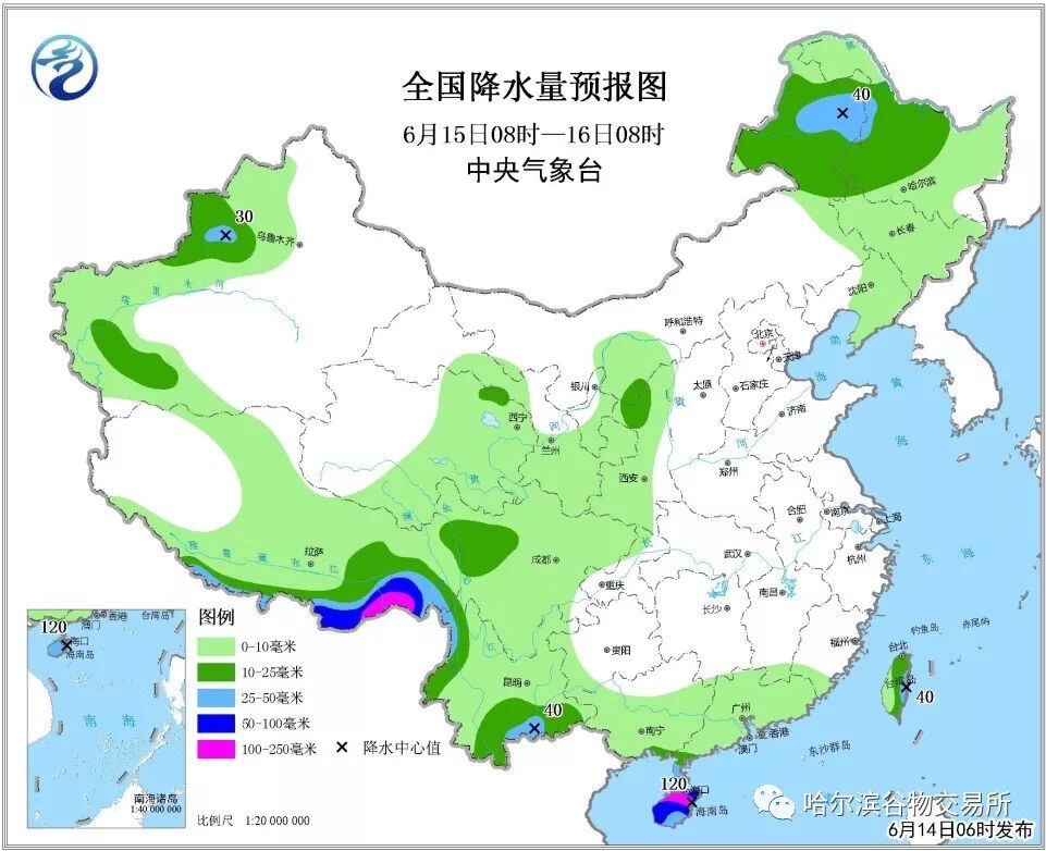 图1 全国降水量预报图(6月14日08时-15日08时) 6月15日08时至16日08时,内蒙古东北部、海南岛等地有较强降水。内蒙古东北部、黑龙江中西部、新疆伊犁河谷、四川西部、西藏东南部、云南西北部和南部、广西南部、雷州半岛、海南岛以及台湾中东部等地有中到大雨,其中,西藏东南部、海南岛中北部等地的部分地区有暴雨,局地大暴雨(100~120毫米),上述局地将伴有短时强降水、雷暴大风或冰雹等强对流天气(见图2)。