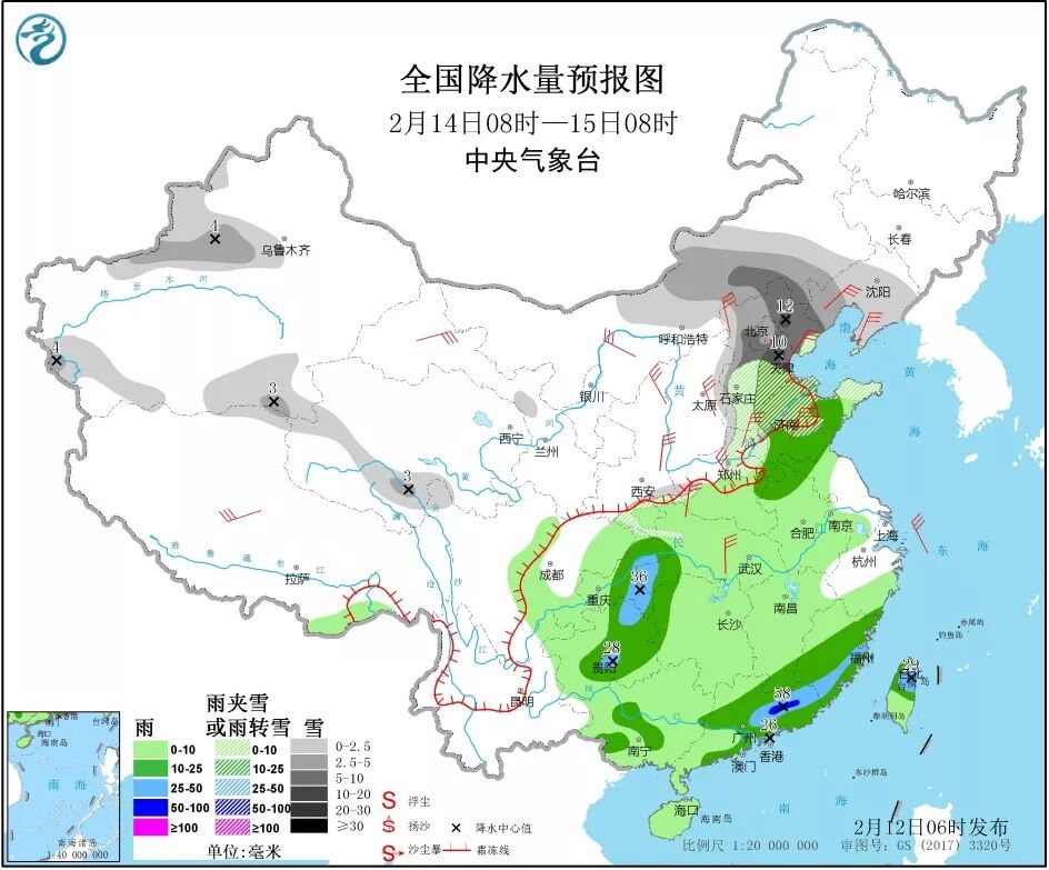 图4 全国降水量预报图(2月14日08时-15日08时) 四、影响与关注 1、华北黄淮等地雾霾及13日夜间起减弱消散情况; 2、江南华南较强降雨和强对流性天气及影响; 3、12-13日新疆甘肃内蒙古及东北地区大风降温降雪天气; 4、14-16日中东部大风降温及较大范围雨雪天气及影响。