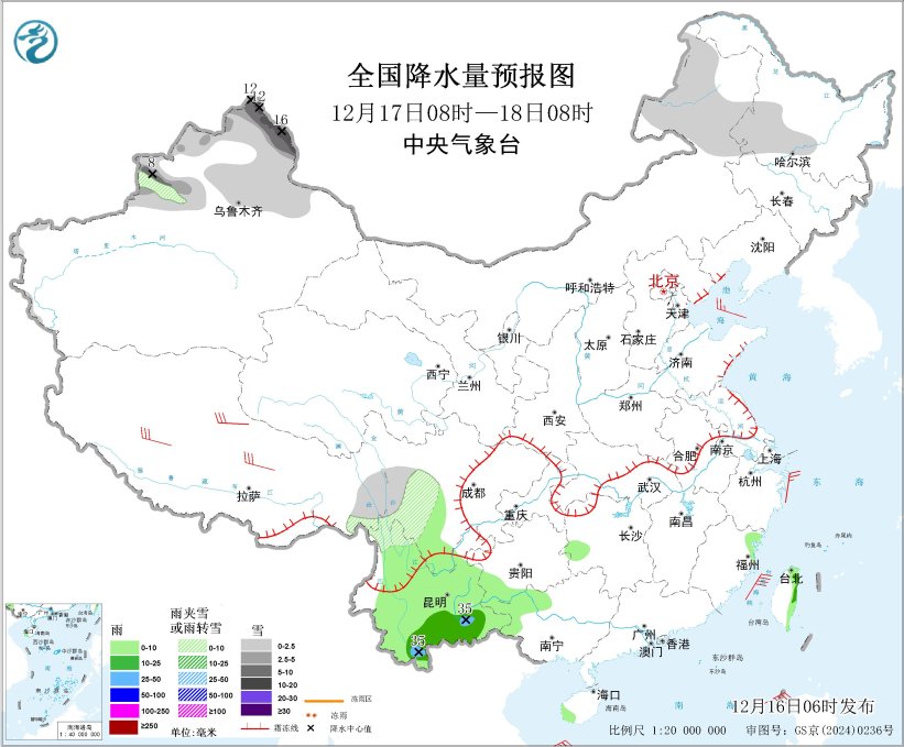 图1 全国降水量预报图(12月16日08时-17日08时) 12月17日08时至18日08时,内蒙古东北部、黑龙江西南部、新疆北部、川西高原南部等地部分地区有小到中雪或雨夹雪,其中,新疆阿勒泰地区和伊犁河谷局地有大到暴雪(10~16毫米)。西南地区南部、湖南西部、福建东北部、广西西北部、海南岛西南部等地部分地区有小到中雨,其中,云南东南部局地有大雨(25~35毫米)。西藏中北部等地部分地区有4~6级风;东海南部海域、台湾海峡、巴士海峡、南海东北部和中东部海域将有5~7级大风、阵风8级(见图2)。