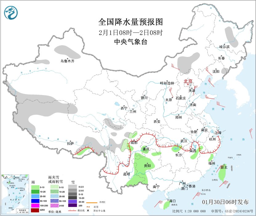 图3 全国降水量预报图(2月1日08时-2日08时)
