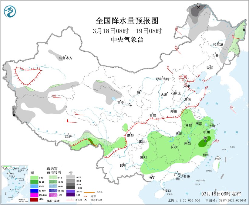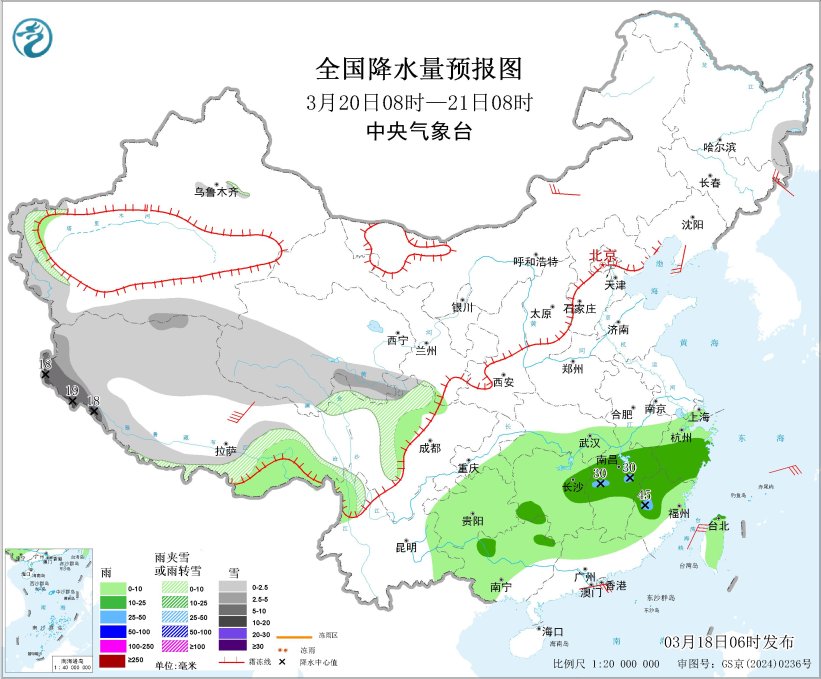 摘要: 国内方面,昨日,西北地区和东北等地出现明显降雪,湖北、安徽、江苏和西藏东南部等地出现中到大雨;今晨内蒙古、宁夏北部等地降温明显。预计未来三天,青藏高原、新疆及东北地区有雨雪天气,部分地区雨雪较强,关注对交通运输、农牧业、工程建设等的影响;西南地区东部至长江中下游多阴雨天气,部分地区累计雨量大,关注连阴雨对农业生产的不利影响,并防范持续降雨可能引发的次生灾害。 全球方面,昨日,澳大利亚、巴西、美国东部等地出现较强降雨;美国中部等地出现强降温。未来三天,拉布拉多半岛有暴风雪;地中海沿岸有较强风雨和沙尘;澳大利亚北部仍有较强降雨。 一、国内天气情况 1.实况 (1)昨日西北地区和东北等地出现明显降雪 昨日8时至今日6时,新疆南疆西部、西藏东部、云南西北部、青海中东部、甘肃中南部、宁夏南部、川西高原北部、河北北部、内蒙古中部和东北部、辽宁中西部、吉林中部、黑龙江西北部等地出现小到中雪或雨夹雪,西藏林芝、四川阿坝、青海果洛、甘肃定西、河北秦皇岛、辽宁鞍山和葫芦岛等地局地大雪或暴雪。 (2) 湖北安徽江苏和西藏东南部等地出现中到大雨 昨日8时至今日6时,西藏东南部、湖北中东部、河南东南部、苏皖等地出现中到大雨,西藏林芝局地暴雨;西藏、青海南部、川西高原、云南和甘肃西部、内蒙古、华北中北部等地部分地区出现8~9级大风,局地10~12级。新疆南疆、宁夏北部、山西北部、京津及东北地区等地出现扬沙或浮尘天气。今晨,内蒙古、宁夏北部等地出现6~10℃较强降温,局地降温幅度超14℃。河南、山东西部、苏皖、浙江东部、贵州西部、云南中南部等地出现能见度不足1000米的大雾,局地能见度不足200米。 2.重点天气预报 (1)西南地区至长江中下游多降水 18日,贵州东部、重庆东部、江汉东部、江南大部、江淮西部、西藏东南部等地仍有小到中雨,局地大雨。 19日至21日,南方地区将再有一次降水过程,江汉、江淮、江南及贵州、广西北部、西藏东南部等地有小到中雨,局地大雨或暴雨。 (2)冷空气影响黄淮及以北地区 受冷空气影响,18日内蒙古中东部、华北、黄淮、东北地区等地降温4~6℃,局地降温8℃以上,上述部分地区并伴有4~6级偏北风,阵风7~8级;渤海将有7~8级、阵风9~10级的东北风,渤海海峡、黄海北部海域将有6~7级、阵风8级的偏北风。此外,18日至19日,内蒙古东北部、东北地区北部有小到中雪或雨夹雪,局地有大雪。 (3)青藏高原仍有雨雪天气 未来三天,西藏西南部、青海南部、川西高原以及新疆南疆西部山区等地部分地区有中到大雪,其中,西藏西南部局地有暴雪。 二、全球天气情况 1.实况 (1)澳大利亚巴西美国东部等地出现较强降雨 昨日,澳大利亚东北部和中南部、所罗门群岛、印度尼西亚、马来西亚南部、泰国南部、莫桑比克中部、阿尔及利亚东北部、突尼斯北部、意大利南部、巴西、巴拉圭、阿根廷中部、智利中部、秘鲁南部、厄瓜多尔、美国东部等地部分地区出现中到大雨,局地暴雨或大暴雨。 (2)美国中部等地出现强降温 昨日,俄罗斯西伯利亚中南部、蒙古国北部、芬兰、挪威、瑞典、土耳其东部、格鲁吉亚、塔吉克斯坦、加拿大西部、五大湖附近等地部分地区出现中到大雪或雨夹雪,其中,五大湖地区东北部出现暴雪到大暴雪。美国中部、加拿大南部、突尼斯、俄罗斯西西伯利亚南部、巴基斯坦东北部等地出现6~10℃降温,局地降温12~16℃。 2.重点天气预报 (1)拉布拉多半岛有暴风雪 未来三天,受高空槽和低层暖湿急流共同影响,加拿大拉布拉多半岛、五大湖地区等地有大到暴雪,部分地区有大暴雪到特大暴雪;上述部分地区伴有5~6级风、阵风7~8级,美国东北部及江河湖面阵风9~11级。 此外,受冷空气影响,美国东部、加拿大东部、墨西哥北部和东部有8~14℃降温,局地降温16~20℃。 (2)地中海沿岸有较强风雨和沙尘 未来三天,受地中海气旋影响,意大利南部、波黑、黑山、阿尔巴尼亚以及利比亚西北部等地的部分地区有中到大雨,局地暴雨;上述部分地区伴有4~6级风、阵风7~8级,沿海地区阵风9~10级;阿尔及利亚东部、利比亚、埃及西部等地有扬沙或浮尘,局地有沙尘暴。 (3)澳大利亚北部仍有较强降雨 未来三天,受低涡系统影响,澳大利亚北部地区、昆士兰州北部和南澳大利亚州东部、巴布亚新几内亚、所罗门群岛、新西兰南岛等地有中到大雨,局地有暴雨到大暴雨,需注意防范持续性降水引发的山洪、泥石流等次生灾害。 三、国内未来三天具体预报 3月18日08时至19日08时,内蒙古东北部、黑龙江北部、吉林东部、新疆南疆西部和南部山区、西藏北部和东南部、青海北部、甘肃河西等地部分地区有小雪或雨夹雪,其中,内蒙古东北部、黑龙江西北部等地部分地区有中到大雪,西藏西部局地有暴雪(10~15毫米);西藏东南部、江淮大部、江南、西南地区东南部、华南北部等地部分地区有小到中雨,其中,浙江南部、福建北部等地部分地区有大雨(25~30毫米)。内蒙古中东部、黑龙江东北部、辽东半岛、青海南部、山东半岛等地部分地区有4~6级风,西藏北部部分地区有7~8级风;渤海、渤海海峡、黄海北部等海域有6~7级风,阵风8级(见图1)。