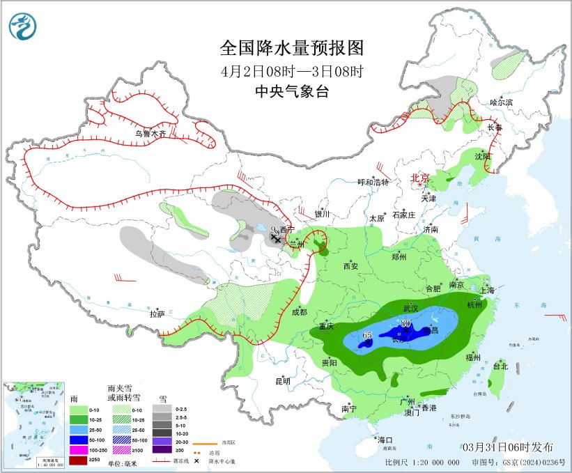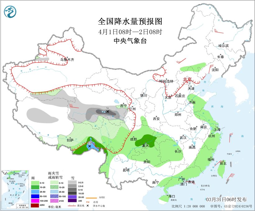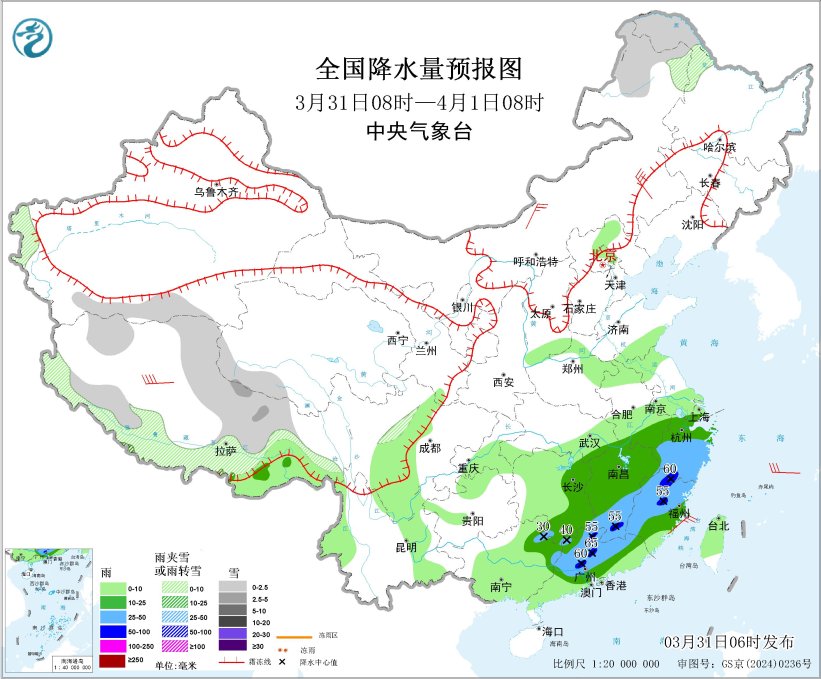 图1 全国强降雨落区预报图(3月31日08时-4月1日08时)