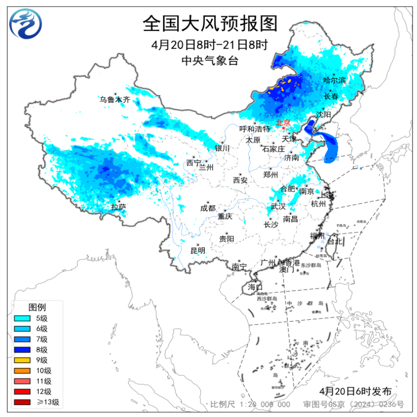 图1 全国强降雨落区预报图(4月20日08时-21日08时) (2)北方地区受冷空气影响有大风沙尘 20日,冷空气将继续影响我国,带来显著降温,东北地区中南部、黄淮、江汉、江南西部等地降温6~10℃,局地降温可达10℃以上。 预计,4月20日08时至21日08时,新疆沿天山地区和南疆盆地、西藏大部、青海大部、甘肃河西、内蒙古中东部、东北地区大部、河北北部、北京、天津、山东半岛、苏皖大部、湖北东部等地部分地区有5~7级风,阵风8~9级,其中新疆东部山口、西藏北部、内蒙古中部局地有8~9级风,阵风10级以上;渤海、渤海海峡、黄海北部海域、黄海中西部和西南部部分海域将有7~8级、阵风9级的大风(见图2)。中央气象台4月20日06时继续发布大风黄色预警。