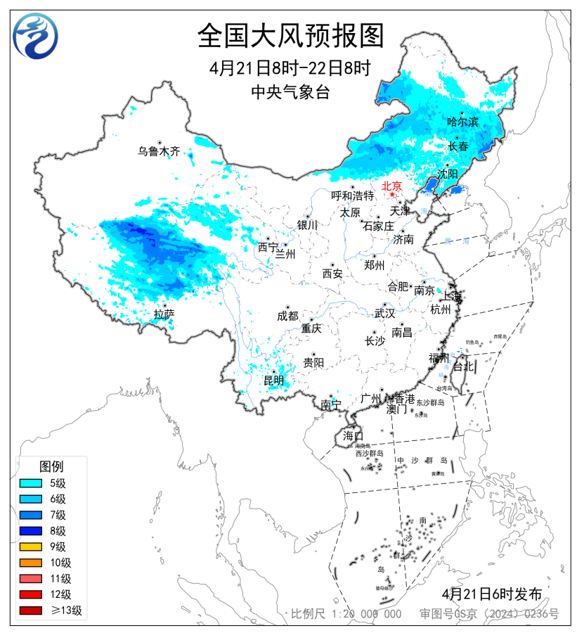 图1 全国强降雨落区预报图(4月21日08时-22日08时) (2)内蒙古和东北地区有大风天气 预计,4月21日08时至22日08时,内蒙古中东部、黑龙江中南部、吉林、辽宁以及新疆南疆盆地、西藏北部、青海西部等地部分地区有5~7级风,阵风8~9级,渤海北部海域、黄海北部海域将有7级、阵风8级的风(见图2)。中央气象台4月21日06时继续发布大风蓝色预警。
