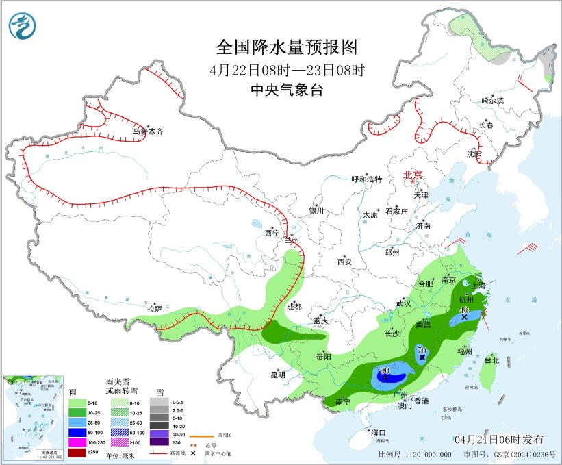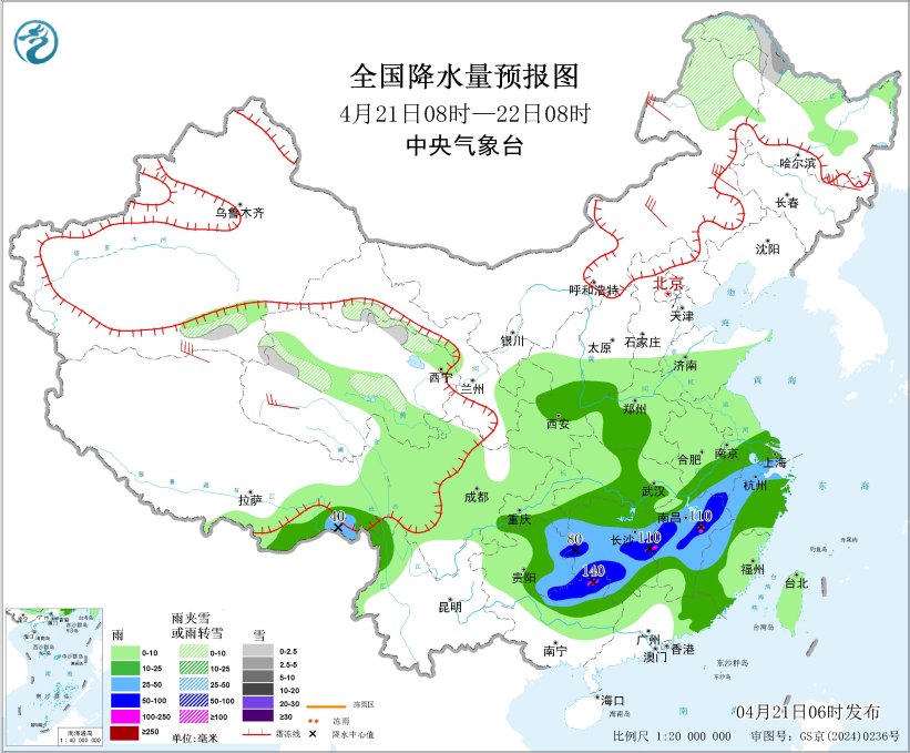 04月21日:未来三天全国天气预报 时间:2026-04-21 来源:中国天气网 我国中东部有一次较大范围降水过程 内蒙古和东北地区有大风天气 摘要: 国内方面,昨日,内蒙古、青海、西藏等地出现大风,湖南、贵州、广西等地出现大到暴雨。未来三天,南方地区有降雨过程,局地伴有强对流天气,关注对农业、交通等的影响,做好灾害防御;内蒙古东部、东北地区等地多大风天气,做好森林草原和城镇防火工作;渤海、黄海等海域风力较大,做好海上交通安全管理。 全球方面,昨日,东南亚等地出现强降雨。未来三天,北美洲东部将有寒潮大风和雨雪天气,阿根廷巴拉圭等地将有强降雨,非洲南部有较强降雨。 一、国内天气情况 1.实况 (1)内蒙古青海西藏等地出现大风 昨日08时至今日06时,内蒙古东部、吉林中西部、辽宁西部、河北北部、青海、西藏、四川西部等地出现7~8级阵风,内蒙古东南部、西藏北部等局地10级以上;新疆南部、青海西部等地部分地区出现扬沙或浮尘;湖北南部、湖南、贵州东部等地部分地区气温下降8~12℃。 (2)湖南贵州广西等地出现大到暴雨 江西中部、湖南中南部、贵州东部、广西北部等地部分地区出现大到暴雨,湖南永州、广西桂林和柳州等局地大暴雨;上述部分地区最大小时降雨量30~70毫米,局地超过80毫米;青海东部、西藏东部、宁夏南部、内蒙古东北部、黑龙江北部等地部分地区出现小到中雪或雨夹雪,局地大雪或暴雪。 2.重点天气预报 (1) 我国中东部有一次较大范围降水过程 21日至23日,受冷暖空气共同影响,我国中东部有一次较大范围降水过程。西南地区东部、江南大部和华南中北部等地有大到暴雨,其中湖南南部和东部、江西中北部、广西北部和广东西北部等地局地大暴雨,并伴有强对流天气;西北地区东南部、黄淮、江淮等地部分地区有小到中雨,其中内蒙古东北部和黑龙江西北部等地部分地区有小到中雪或雨夹雪。 预计,4月21日08时至22日08时,重庆东南部、贵州东部、湖南中南部、江西中北部、安徽南部、浙江西部和北部、上海南部、广西东北部等地部分地区有大到暴雨,其中,湖南中部、江西中部、广西东北部等地局地有大暴雨(100~140毫米)。上述部分地区伴有短时强降水(最大小时降雨量20~40毫米,局地可超过50毫米),局地有雷暴大风或冰雹等强对流天气(见图1)。中央气象台4月21日06时继续发布暴雨黄色预警。