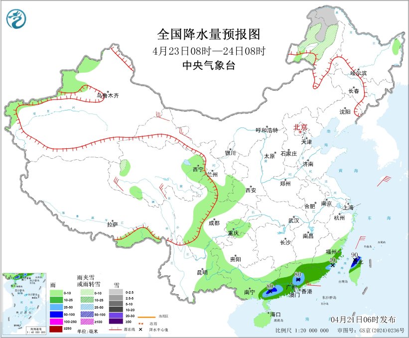 图5 全国降水量预报图(4月23日08时-24日08时)