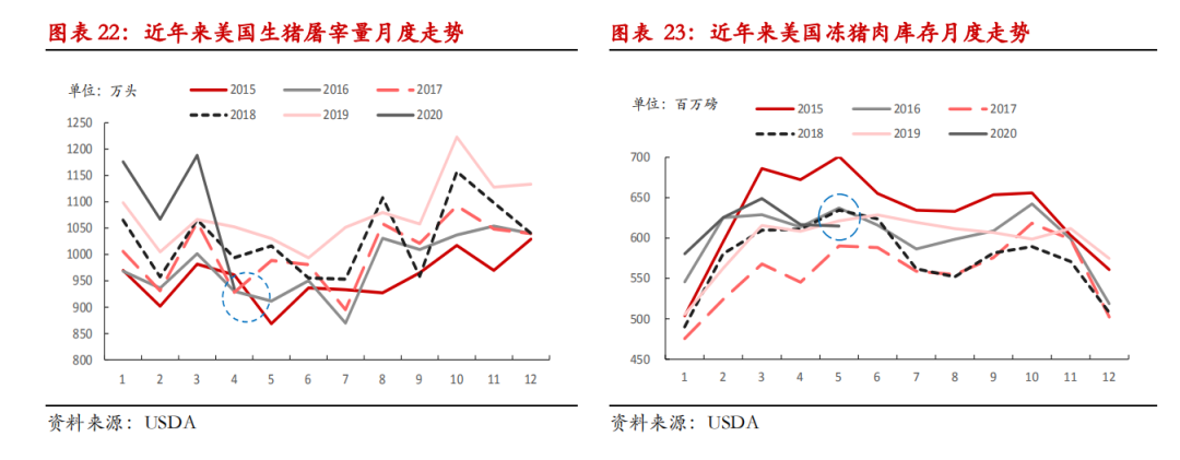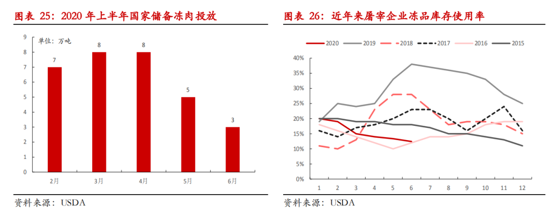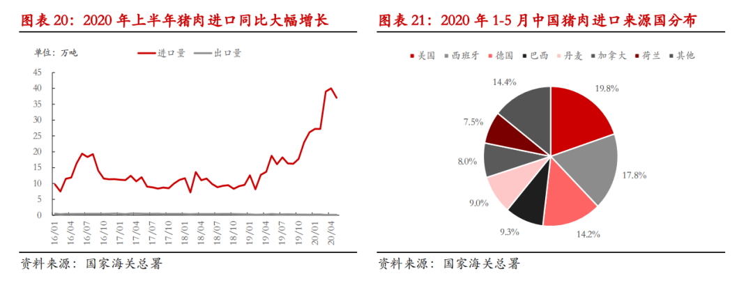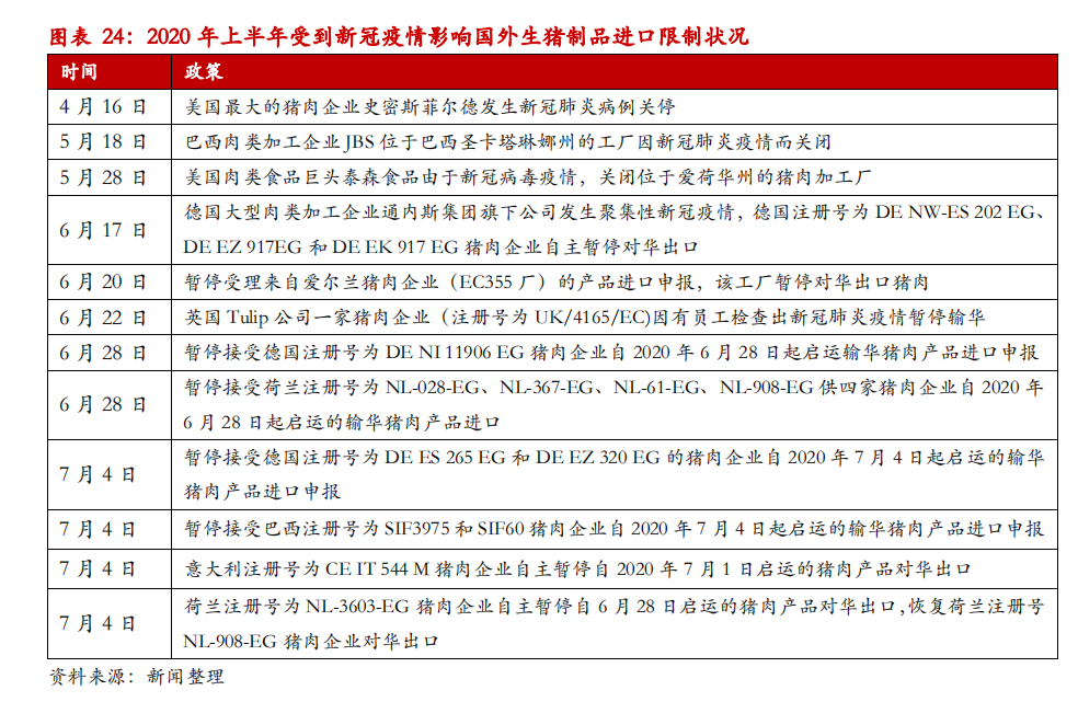 从进口来源国来看,进口量占比超过5%的国家分别是美国(19.8%)、西班牙(17.8%)、德国(14.2%)、巴西(9.3%)、丹麦(9%)、加拿大(8%)和荷兰(7.5%),进口量同比涨幅前五位的国家分别是墨西哥(1360%)、葡萄牙(1216%)、美国(531%)、丹麦(292%)和奥地利(279%)。2020年上半年美国成为我国最大的猪肉来源国,进口量同比涨幅显著,这主要是由于按照贸易第一阶段的协定,我国扩大美国猪肉进口规模,同时2020年1月1日起,美国猪肉进口税从12%下调至8%。 ![]() 新冠疫情在全球的蔓延给猪肉进口带来了新的不确定因素,美国当前确诊病例超过三百万例,全球占比达到26%,多个大型生猪屠宰场员工集体性感染新冠疫情导致屠宰场被迫关停。根据美国农业部统计的数据显示,截止2020年5月下旬,在全美181家猪肉加工厂中,已经有超过1.4万名新冠肺炎确诊病例,其中54人死亡,造成40%生猪屠宰产能停摆。同时美国农业部预计,2020年4月25日到9月19日,将有1006.9万头生猪被迫实施安乐死,折合猪肉将损失129.69万吨,占据美国2019年猪肉产量的10%左右,消费量的13%左右。2020年美国生猪整体存栏持续增长,2020年1-3月,美国生猪屠宰量处于历史高位,同比增长6%-12%,4月份屠宰产能受到冲击,月度屠宰量骤降至935.3万头,同比下滑11.1%,美国冻肉库存进入4、5月份也出现明显高位回落。 ![]() 新冠疫情蔓延到欧洲各国,肉类屠宰加工业受到显著影响,多个屠宰加工厂被迫关停,同时,北京新发地批发市场三文鱼中监测出欧洲流行的新冠病毒后,海关对肉制品进口防控更加严格。2020年6月以来海关公布15家猪肉企业暂停输华,涉及7个国家。 ![]() 2020年6-12月我们预计进口量总体同比仍会大幅增加,但是受到新冠疫情的影响,进口来源国受到限制,从5月的进口量我们已经看到了回落趋势,2020年6-12月的月均进口量预计略小于或等于2020年1-5月的月均进口量,预计整体进口水平在200-240万吨,同比增加66-105万吨。