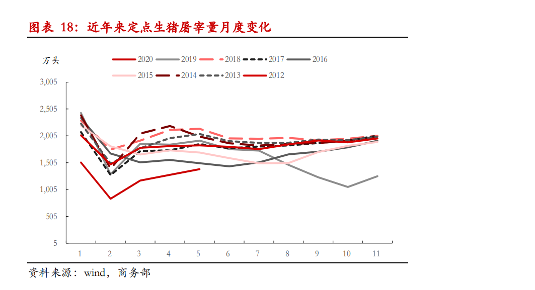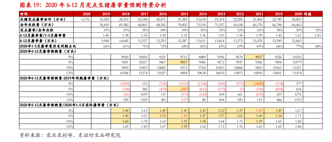 截止2020年5月,1-5月定点生猪屠宰量累计为6176万头,是历史同期的61%-77%,均值为68%。即受到非洲猪瘟疫情的影响,2020年上半年生猪屠宰量仅为历史同期的6-7成。为推测2020年6-12月生猪的出栏情况,对比过去十年2009年-2019年6-12月份和1-5月份生猪定点屠宰的比例,可以发现6-12月屠宰量是1-5月屠宰量的1.35-1.61倍,均值为1.45倍。考虑到2019年年末和2020年年初生猪补栏集中度高于往年,我们假设2020年6-12月定点生猪屠宰量在历史各年6-12月的基础上多增长3%、5%、10%和12%四种情形。例如已知2020年1-5月定点生猪屠宰量是2018年1-5月屠宰量的61%,在下半年3%的额外增长假设下,2020年下6-12月的定点生猪屠宰量将为2018年6-12月定点屠宰量的64%。