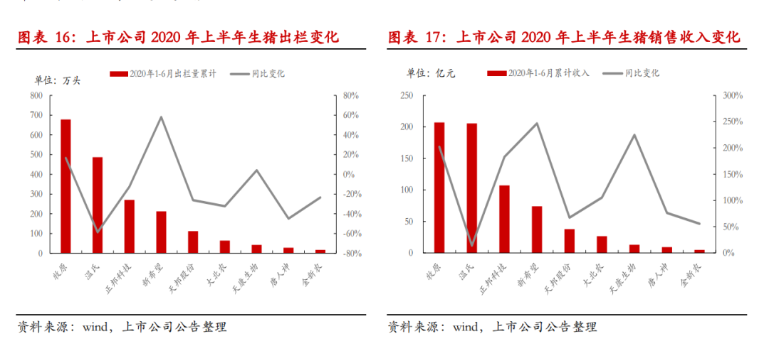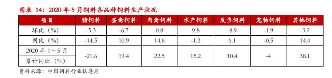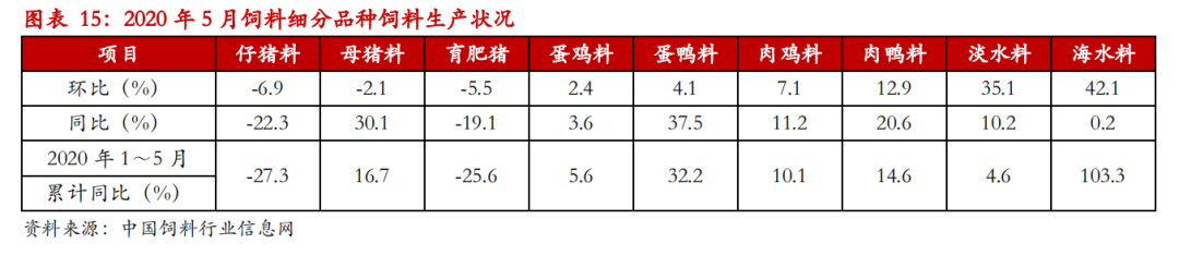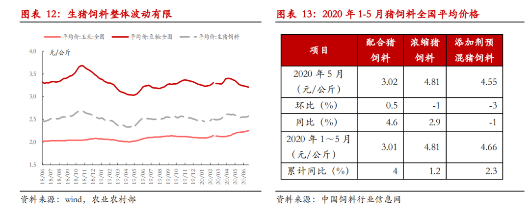 能繁母猪和仔猪价格涨幅显著,表明当前市场能繁母猪和仔猪供应严重缺乏。根据实际调研情况来看,现在市场上三元母猪配种的情况较为常见。大型屠宰场反映当前屠宰商品猪中母猪占比仅不到10%,疫情发生前正常占比在50%左右,说明大量商品母猪用作种猪配种,但是三元商品猪用作母猪的繁殖性较差,PSY比能二元能繁母猪低20%-30%,这将在一定程度上限制后续生猪存栏恢复,预计整体生猪存栏恢复进度稍逊于母猪存栏恢复状况。 ![]() ![]() 饲料成本:与仔猪成本相比,饲料成本变动相对有限。根据中国饲料业协会的统计,生猪配合料、浓缩料和预混料2020年1-5月份的均价分别为3.01元/公斤、4.81元/公斤和4.66元/公斤,同比累计上涨4%、1.2%和2.3%。2020年上半年猪饲料价格上涨主要受到玉米价格推动,玉米原料1-5月均价2.05元/公斤,同比上涨8.1%,豆粕原料1-5月均价3.11元/公斤,同比上涨5.6%。饲料成本头均增长在50元/头以内,对比当前的养殖利润,饲料成本上涨压力几乎可以忽略不计。 ![]() 饲料用量:饲料用量状况也可以反映当前生猪的存栏状况。根据中国饲料业协会的统计,2020年1-5月,我国饲料用量总量同比增长3.1%,其中猪饲料累计同比减少21.6%,蛋禽、肉禽、水产和反刍饲料均有较为显著的增长。细分来看,猪饲料中母猪料同比呈现上涨趋势,1-5月累计上涨16.7%,仔猪料和育肥猪料累计同比分别下降27.3%和25.6%。这与1-5月大量三元母猪配种,仔猪和生猪供应紧张的格局相吻合。 ![]() ![]() 上市公司出栏状况:2019年下半年以来,由于生猪供应缺乏,生猪价格迅速上涨至历史高位,推高整体物价,CPI环比涨幅显著。为保证居民基本消费需求,稳定物价,生猪产能恢复建设成为各地政府工作的重要内容之一。2020年中央一号文件明确指出要“加快恢复生猪生产。”为积极推动生猪补栏,各地放宽生猪养殖建设用地审批要求,鼓励大型和中小散户共同参与生猪养殖。就实际调研的状况来看,规模企业是当前生猪补栏的主力,中小散户资金实力有限,卫生防疫设备不足以及生物安全防控措施不到位,补栏能力和复养成功率均较低。以全国生猪养殖集中的四川省为例,超过80%的中小散养殖户被迫退出市场。从2019年下半年以来,规模企业和地方政府合作建设生猪养殖基地项目近百个,全国各地均有分布,以北方地区和四川、云贵地区较为集中。就调研状况来看,当前大型项目建设顺利推进,但是从土地审批、场地建设、引进种猪到生猪育肥出栏至少需要一年半到两年的时间,从2019年9月开工建设,也需要2020年年底才能形成有效产能,预计规模项目集中形成产能的时间在2021年年中左右。