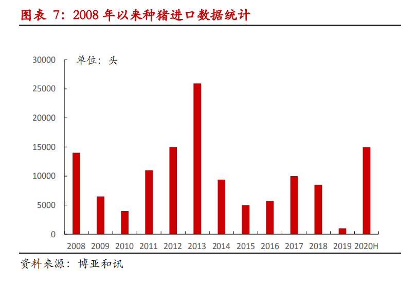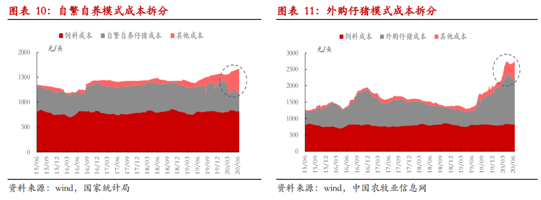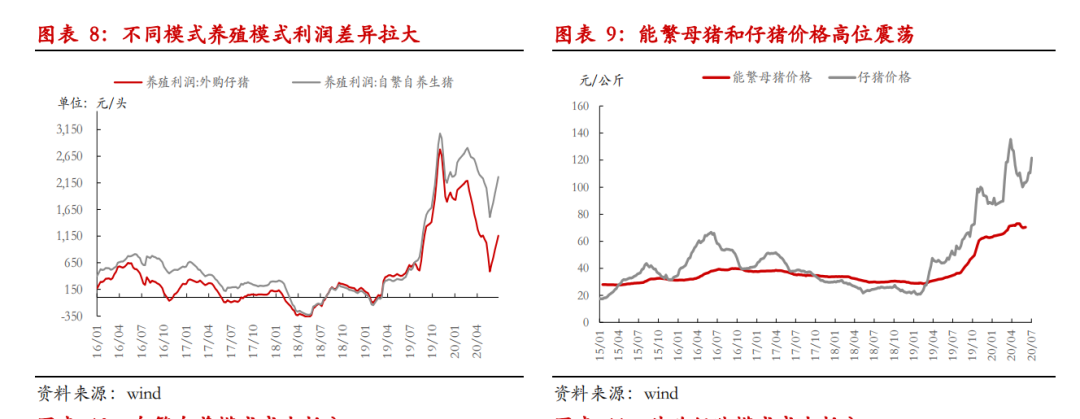 种猪引种量:根据博亚和讯的统计,我国2020年上半年原种猪进口猪数量创历史新高,仅半年就达14985头,超过2013年以来各年全年生猪引种量。一般原种猪从配种、繁育二元猪、母猪配种产仔到商品猪育肥出栏至少需要18-22个月的时间。2019年全年原种猪引种量仅1018头,为历史低值,预计2020年上半年引进的原种猪将从2021年下半年开始有较为显著的产能释放。 ![]() 养殖利润:由于生猪价格处于历史高位,2020年上半年生猪养殖利润十分可观,外购仔猪和自繁自养的养殖利润波动区间分别在486元/头-2136元/头和1507元/头-2720元/头。不同养殖模式利润分化较大的主要原因是仔猪成本过高。自繁自养模式下仔猪和饲料成本占比和非瘟疫情发生前几乎相同,分别为22%和49%,但外购仔猪模式下仔猪和饲料成本占比分别为52%和30%,仔猪成本占比非瘟疫情发生前翻倍。