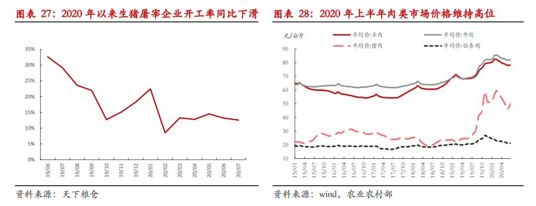 生猪产业链上下游经营状况差异较大,由于生猪供应紧张,养殖企业具有价格的主导权,盈利可观,屠宰企业只能接受高价,同时下游消费相对疲软,白条猪肉的走货并不紧俏,提价空间有限,我们通过2020年5月中旬以来肉猪价差显著缩小,也可以判断当前下游猪肉行情弱于生猪行情,猪肉消费不佳。根据天下粮仓的统计,由于屠宰量下滑,2020年7月屠宰企业开工率降至12.6%,同比下滑62%,多数大型屠宰企业的屠宰量难以覆盖固定成本,被迫亏损经营。