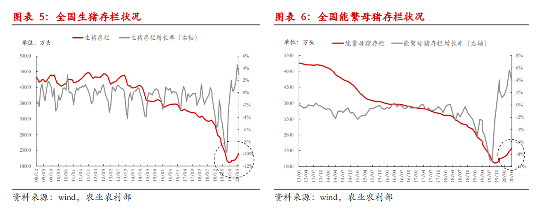 肉猪价差:自猪价大幅攀升以来,猪肉供应紧缺,肉猪价差显著拉大,从疫情前6-10元/公斤的波动区间上升到10-16元/公斤的区间波动。从6月下旬以来,肉猪价差明显收窄,主要是由于生猪供应紧张,养殖户挺价意愿较强,猪价持续走高,但下游消费较差,白条猪肉走货疲软,猪肉提价能力有限,后期消费没有明显增长,肉价或将对猪价上涨形成制约。 ![]() 区域价差:猪价全国区域价差反映了生猪跨区域的流通状况。非瘟疫情发生以前,全国生猪区域最大价差在2-3元/公斤,生猪跨区域调运较为普遍。2018年非瘟疫情爆发初期,受到疫区封锁调运政策的影响,全国区域最大价差达到10元/公斤,后逐步收窄。2020年初受到新冠疫情的冲击,各省交通运输不畅,区域价差最大达到15元/公斤。4月以来随着全国运输状况好转,区域最大价差回归至5元/公斤上下的正常水平,没有非瘟疫情发生的省份活猪调运量显著增加。从区域分布来看,四川和东南沿海地区的广东、福建和浙江为生猪传统调入省份,猪价处于全国高位,内蒙和东三省作为生猪调出区域,猪价是全国洼地。 ![]() ![]() 2.生猪供应 2.1 生猪养殖:生猪存栏逐步回升,规模企业为补栏主力 生猪存栏:受到非洲猪瘟疫情的影响,全国生猪存栏大幅下降,2019年9月生猪产能去化最严重时,全国生猪存栏量仅19190万头,比非瘟疫情爆发前的存栏下降超过40%。2019年10月以来,全国生猪和能繁母猪存栏触底回升,连续9个月持续上涨,截止2020年5月,全国能繁母猪的存栏2375万头,比2019年9月存栏最低点上涨24%,恢复到2018年8月非瘟疫情发生前存栏量的76%,9个月的月均增长率为1.73%。生猪存栏量同步得到恢复,农业农村部自2019年11月以来除了2020年3月和5月公布了环比涨幅,其他时间没有明确数据公布,但由于基数较大,生猪存栏恢复略慢于能繁母猪存栏恢复。